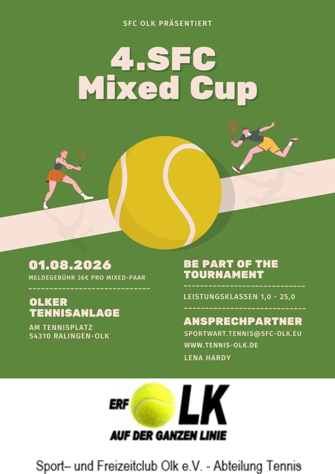 Willkommen auf der Webseite der Tennisabteilung des SFC Olk. Mit Blick ins Sauertal gelegen, bietet unsere schöne Sandplatzanlage mit 2 Plätzten und einem voll ausgestatteten Vereinsheim inkl. Sanitäranlagen alles was es für einen vollendeten Tennistag braucht.